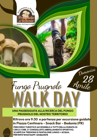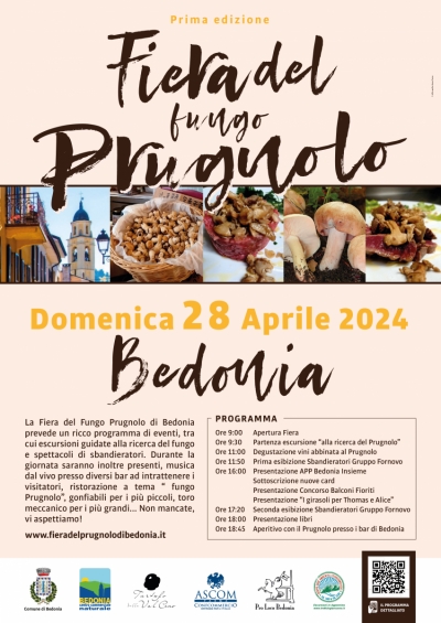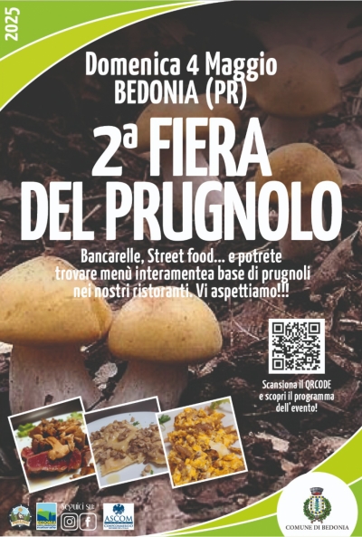 La Fiera del Fungo Prugnolo di Bedonia prevede un ricco programma di eventi, tra cui escursioni guidate alla ricerca del fungo e spettacoli di sbandieratori. Durante la giornata saranno inoltre presenti, musica dal vivo presso diversi bar ad intrattenere i visitatori, ristorazione a tema " fungo Prugnolo", gonfiabili per i più piccoli, toro meccanico per i più grandi... non mancate, vi aspettiamo!